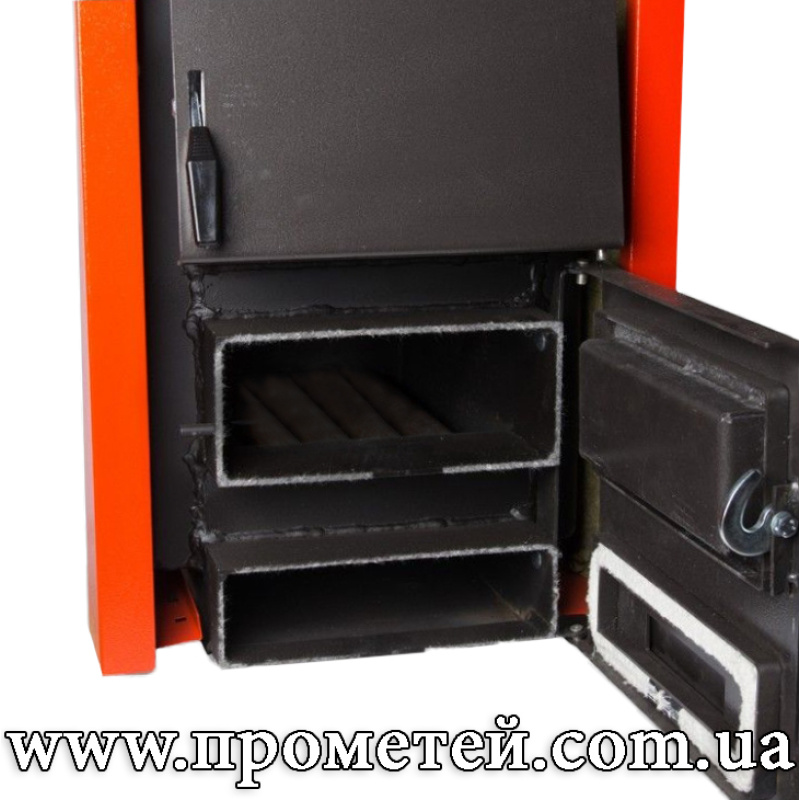 Теплообменник выполнен в виде горизонтальных водяных полок. Они расположены непосредственно над зоной горения и эффективно отводят выделенное тепло. Это позволяет достичь максимальной производительности при сравнительно компактных размерах котла.