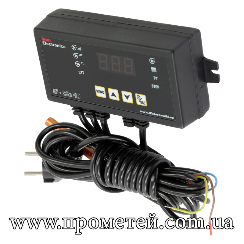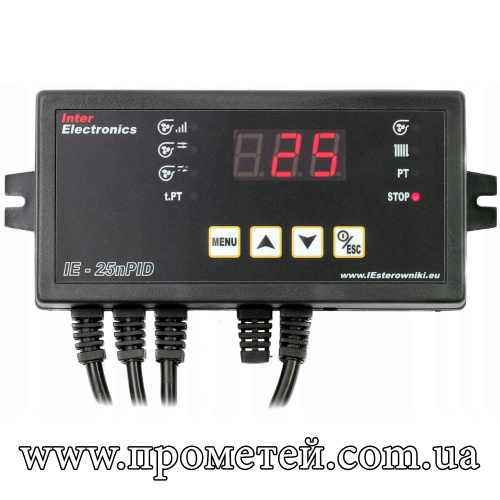 Контролер Inter Electronics IE-25n PID – автоматика для твердопаливних котлів, що керує нагнітальним вентилятором та насосом циркуляції води. Оснащений алгоритмом управління PID, який забезпечує роботу котла плавним регулюванням обертів вентилятора на основі вимірювання температури теплоносія.