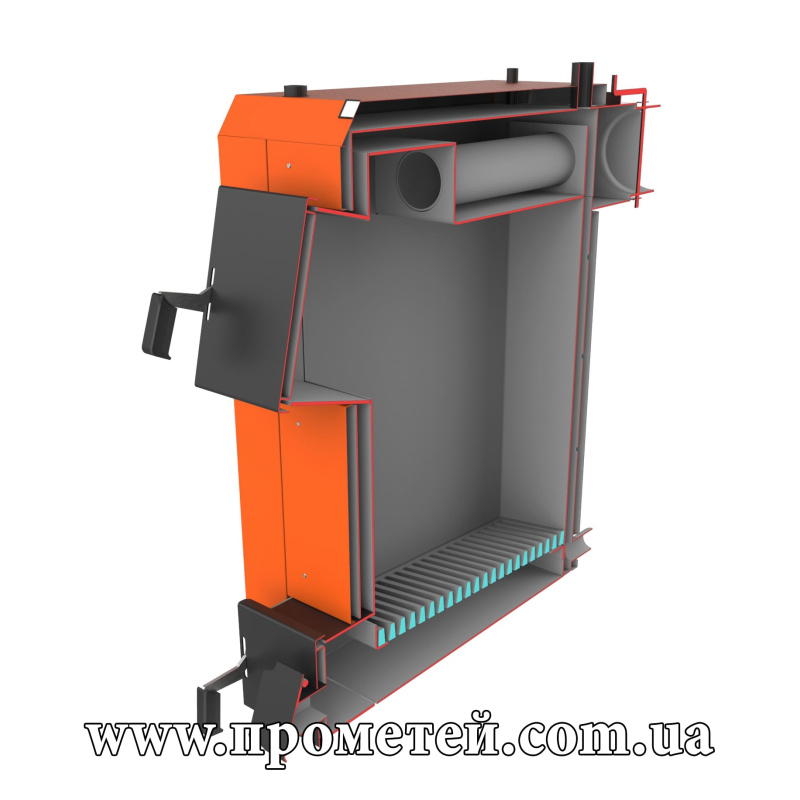 Верхняя дверца расположена под углом к корпусу. Через нее удобно и загружать топливо, и чистить теплообменник.