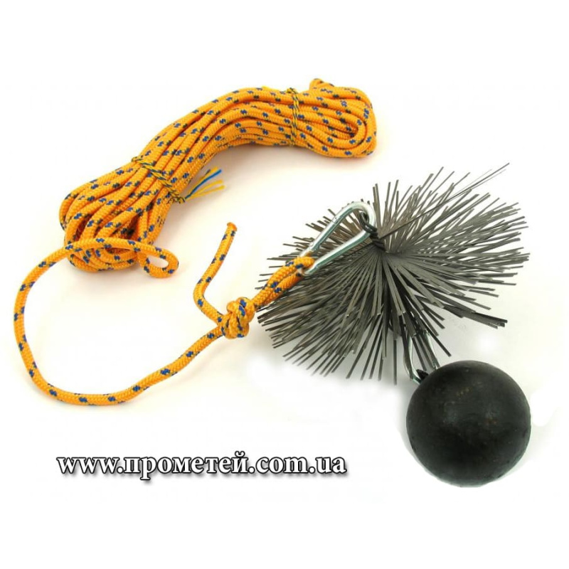 Конструкция ершика имеет с одного конца хвостовик с резьбой для соединения с держателями (см. ниже), а с другого – ушко для закрепления щетки к веревке или канату. Эти крепления позволяют использовать щетку различными способами: можно чистить дымоход снизу (через ревизию или напрямую из топки), используя держатель, или сверху, опуская щетку на веревке с грузом.