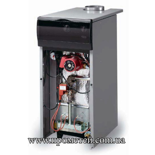 Теплообмінник виготовлений із жароміцного чавуну. Має ефективну у плані теплопередачі секційну конструкцію. Циркуляцію теплоносія забезпечує вбудований тришвидкісний насос, оснащений клапаном для автоматичного відведення повітря. Передбачено запобіжний клапан та можливість підключення зовнішнього накопичувального бойлера.