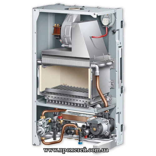 Котел двоконтурний, з двома теплообмінниками – для опалення та гарячої води. Така будова дозволяє незалежно регулювати температуру в кожному контурі та забезпечувати підігрів води під час того, як котел опалює будинок, або навіть при вимкненому опаленні.