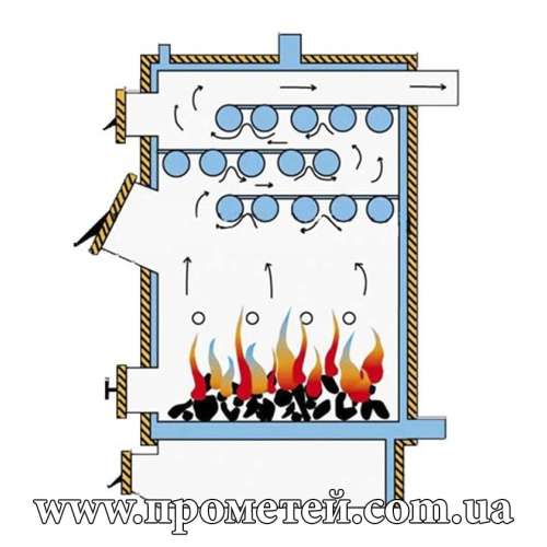 - Многоходовой трубный теплообменник (от 44 до 65 кВт – три полки), конструкция которого позволяет максимально эффективно отбирать тепло из дымовых газов. Это существенно повышает общий КПД котла и минимизирует выбросы тепла в атмосферу.