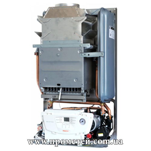 Теплообменник котла раздельный. Отопительный контур медный, контур ГВС – из нержавеющей стали. Такая конструкция устойчива к образованию накипи, ее легко чистить и ремонтировать.