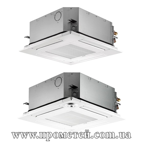 - Внутрішній касетний блок теплового насоса обладнаний розподільною решіткою з чотирма роздільними повітряними потоками. Кожен з цих потоків має регульовані заслінки, завдяки чому повітря може бути спрямоване не тільки вниз, а й горизонтально, що особливо актуально для приміщень з невисокими стелями.