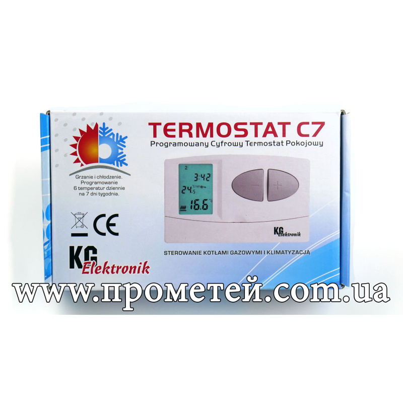 KG Elektronik C7 – програмований терморегулятор для автоматичного управління газовими котлами, кондиціонерами та автоматикою для твердопаливних котлів. Інтелектуальне програмування до 6-ти часових інтервалів на добу з індивідуальними температурними режимами на кожен день тижня забезпечує максимальний комфорт та економію енергоресурсів.