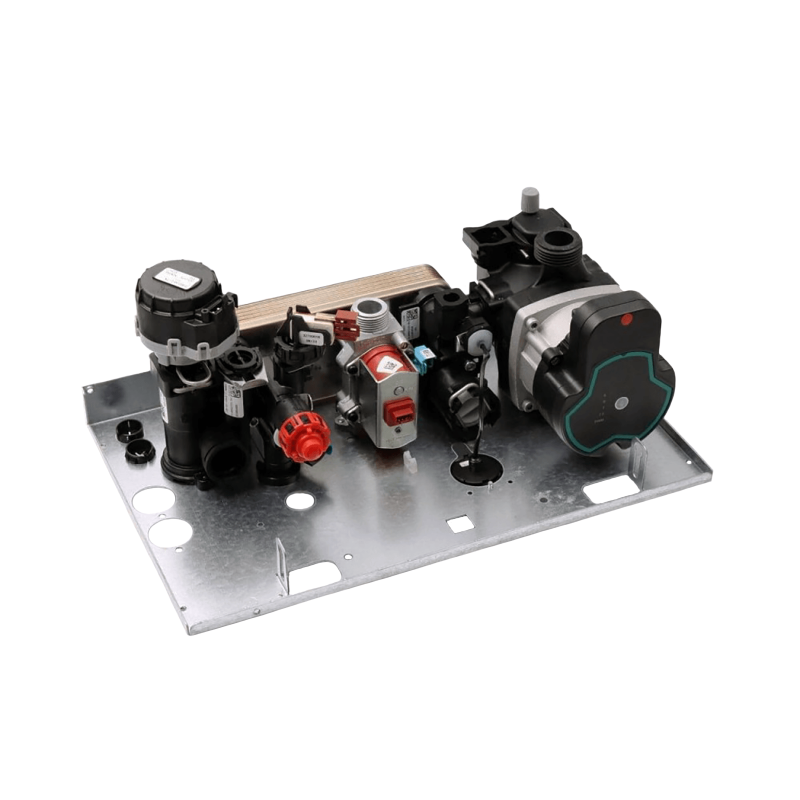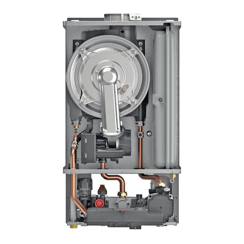 - Теплообмінна система: основним компонентом котла є теплообмінник із нержавіючої сталі з розширеними внутрішніми проходами. На відміну від алюмінієвих аналогів, нержавіюча сталь стійка до хімічного впливу конденсату та має високу механічну міцність. Збільшений переріз труб запобігає засміченню теплообмінника накипом або шламом із системи опалення, що забезпечує стабільну циркуляцію теплоносія та тривалий термін служби без частої промивки. Для підігріву побутової води використовується окремий вторинний пластинчастий теплообмінник (також виготовлений з нержавіючої сталі), який дозволяє отримувати гарячу воду стабільної температури одразу після відкриття крана.