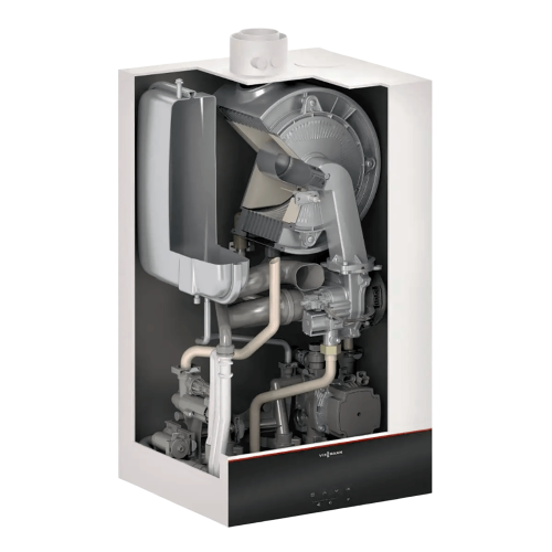 - Керування котлом та діагностика: лицьова панель обладнана лаконічним LCD-дисплеєм із сенсорними кнопками. Вбудований інтерфейс Wi-Fi дозволяє підключити котел до інтернету без додаткових модулів. Через мобільний додаток ViCare користувач може змінювати температурні режими, встановлювати графіки роботи та отримувати сповіщення про стан системи прямо на смартфон.