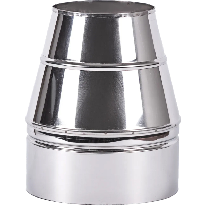 Конус термо дымоходный нерж/нерж, диаметр 100-400 мм, из нержавеющей стали AISI 201, толщиной 1мм – это защитный элемент утепленной дымоходной системы, предохраняющий торцы утеплённой трубы от попадания дождя и снега на утеплитель дымохода. Изготовлен из внутренней трубы из нержавеющей стали и внешнего кожуха также из нержавеющей стали. Также используется для перехода с одностенного элемента дымоходной системы на утеплённый сэндвич.