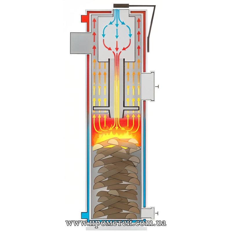 У верхній частині топки розташована камера підігріву повітря. Саме повітря надходить у строго дозованій кількості й у певну точку за допомогою розподільника повітря. Він, поступово, разом зі згорівшим паливом, опускається вниз під власною вагою. Все це і дозволяє досягти такого тривалого горіння на одній закладці палива.