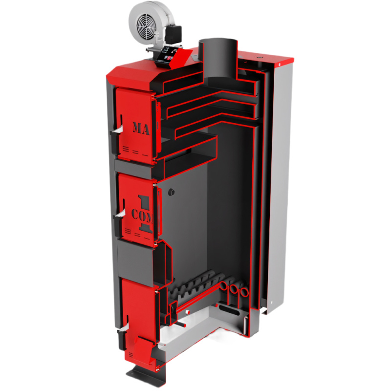 Трехходовой теплообменник с водяными полками спроектирован таким образом, чтобы обеспечить максимально эффективный отбор тепла. Доступ для обслуживания конвекционных каналов обеспечивает ревизионный люк в передней части котла. В нижней части объемной топки расположены водоомываемые колосники, изготовленные из толстостенных бесшовных труб. Они обеспечивают увеличение теплообменной поверхности и повышают КПД котла. При этом не прогорают благодаря охлаждению за счет постоянно циркулирующей в них воды.