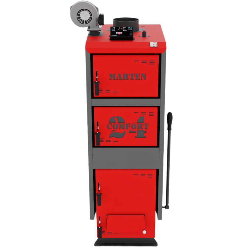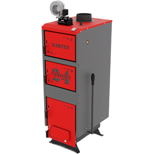 Marten Comfort 24 – твердотопливный котел длительного горения, тепловая мощность которого позволяет отапливать помещение до 240 м2. Управляется с помощью электронного регулятора температуры. Подходит для отопления жилых, бытовых, коммерческих объектов с системой центрального отопления.