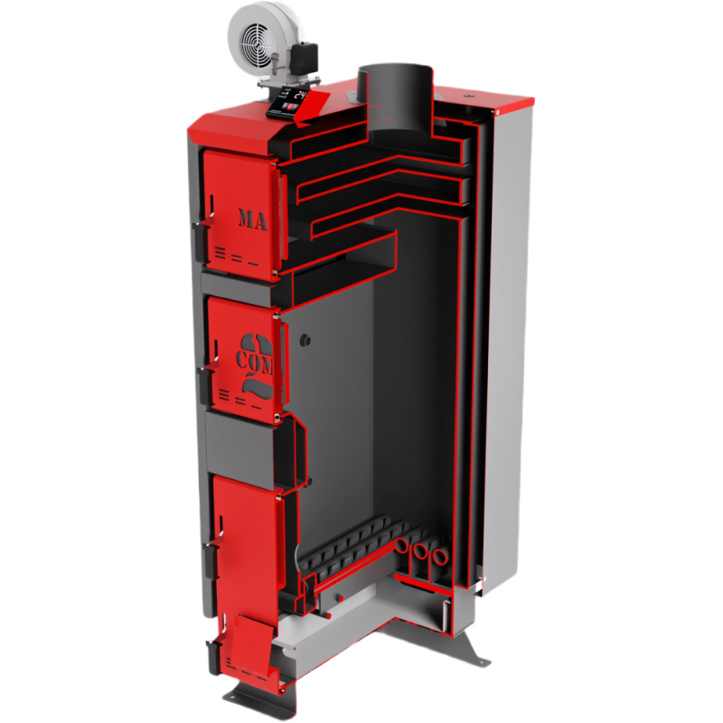 В базовой комплектации котла Мартен Комфорт есть блок управления (контроллер) и вентилятор наддува, которые управляют горением путем нагнетания или перекрытия воздуха в топочной камере. Это позволит всегда выставлять нужную температуру теплоносителя, что продлевает время горения на одной закладке дров на 20-30% и, соответственно, уменьшает расход топлива.