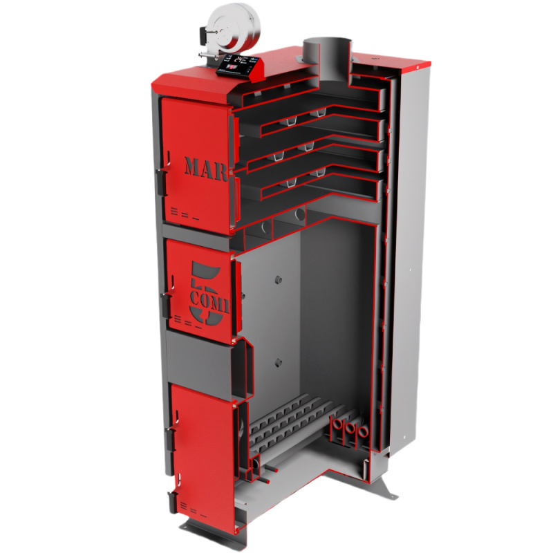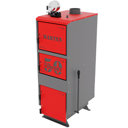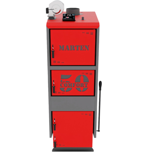 Marten Comfort 50 – твердотопливный котел длительного горения, тепловая мощность которого позволяет отапливать помещение до 500 м2. Управляется с помощью электронного регулятора температуры. Подходит для отопления жилых, бытовых, коммерческих объектов с системой центрального отопления.