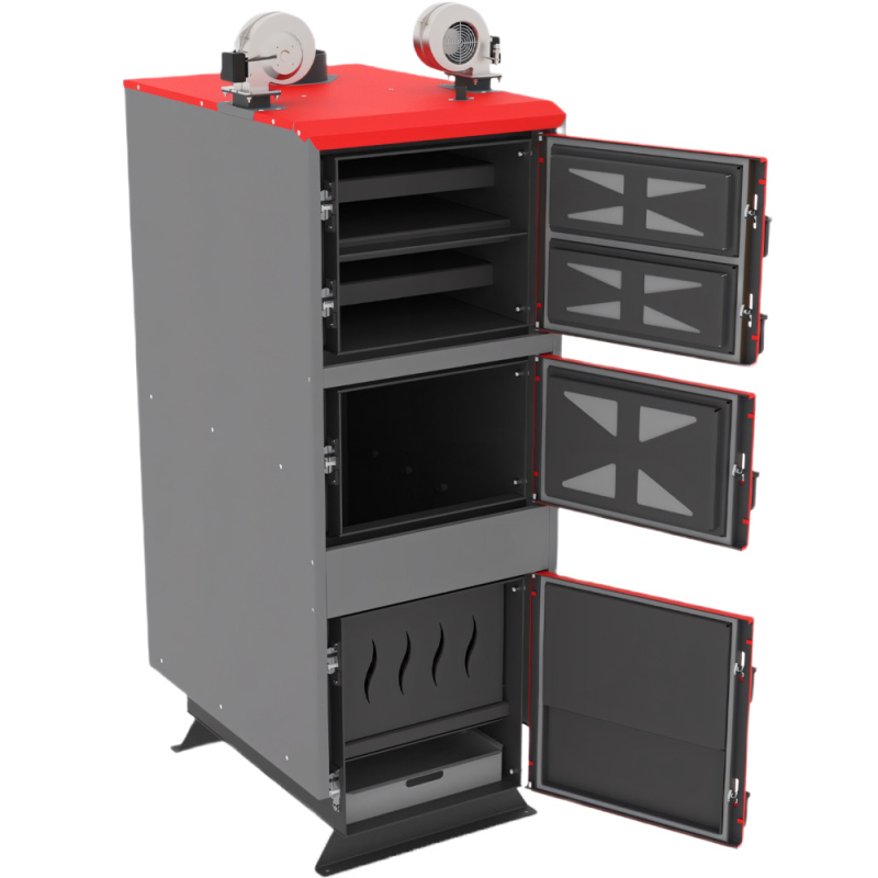Трехходовой теплообменник с водяными полками спроектирован таким образом, чтобы обеспечить максимально эффективный отбор тепла. Доступ для обслуживания конвекционных каналов обеспечивает ревизионный люк в передней части котла. В нижней части объемной топки расположены водоомываемые колосники, изготовленные из толстостенных бесшовных труб. Они обеспечивают увеличение теплообменной поверхности и повышают КПД котла. При этом не прогорают благодаря охлаждению за счет постоянно циркулирующей в них воды.