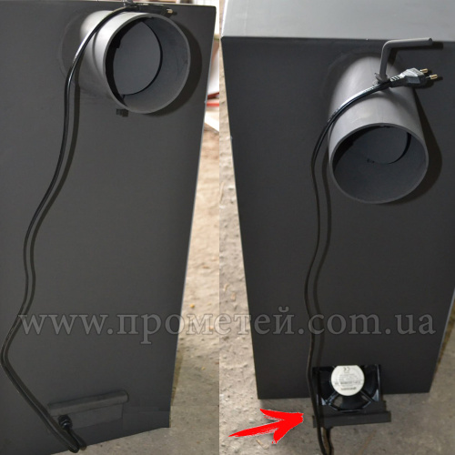 В нижней части трубы установлен мощный вентилятор в металлическом корпусе, который забирает холодный воздух из помещения и прогоняет его через трубу. Нагретый воздух выходит через переднюю часть печи, а специальная конструкция кожуха способствует его равномерному распределению.