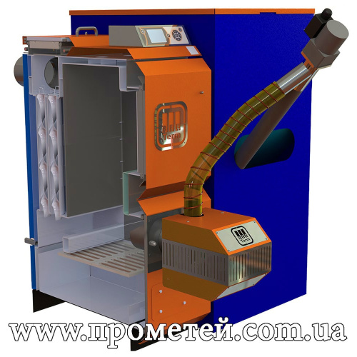 Топливо хранится во вместительном бункере, объема которого хватает на 3-5 дней непрерывной работы, и подается на горелку с помощью шнека автоподачи. Бункер может располагаться и справа, и слева от корпуса. Причем он достаточно компактный и не занимает много места, что удобно для небольших котельных помещений.