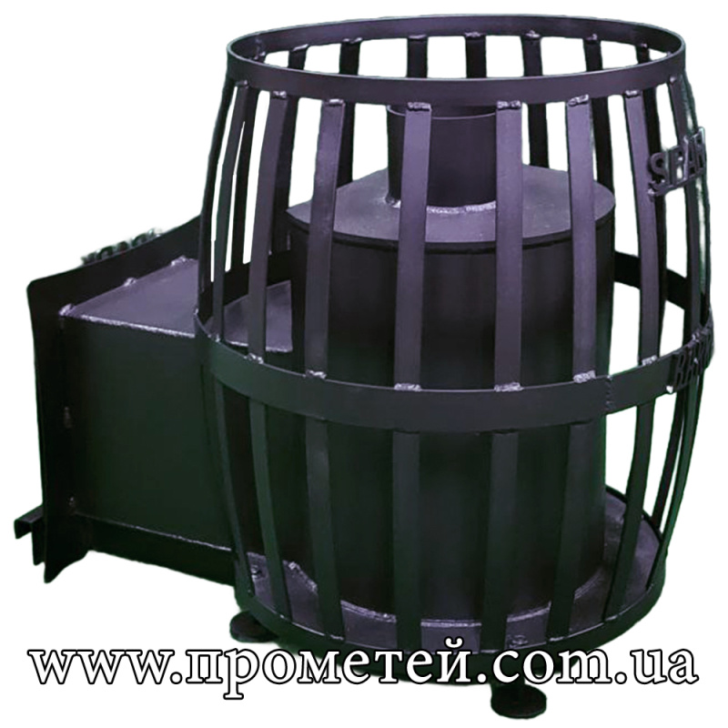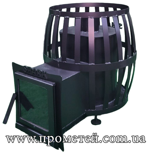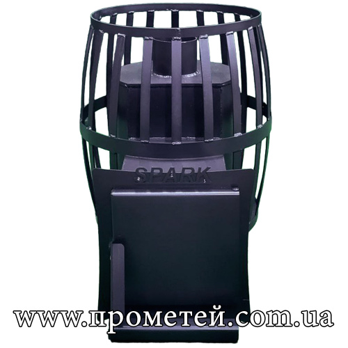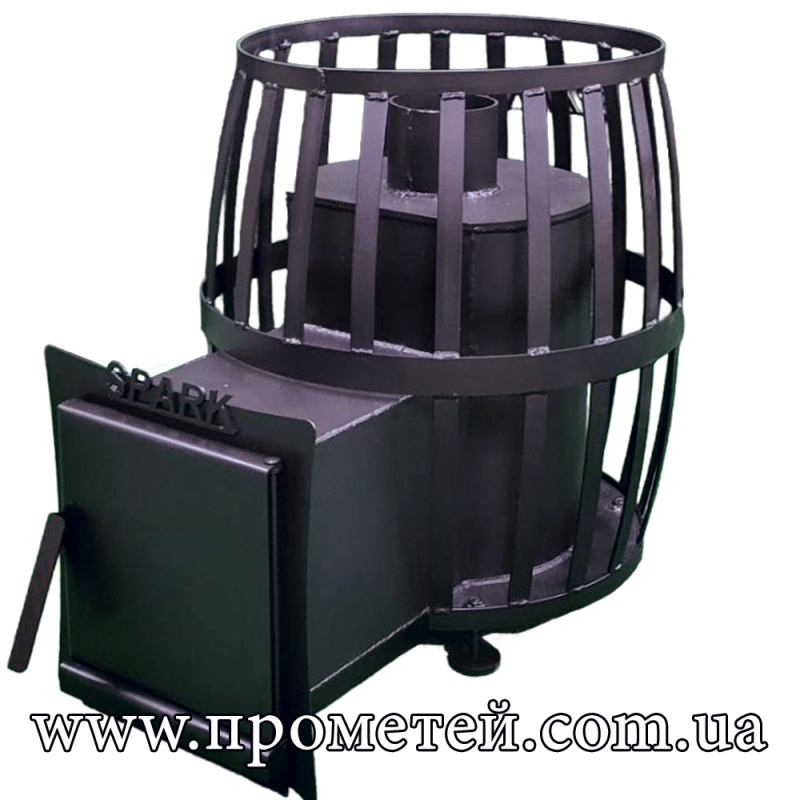 Піч для бані Spark S.k.b.00 – ефективна дров'яна піч кам'янка для парилки до 14 куб. м, з об'ємним кошиком для каміння в формі бочки. Призначена для опалення та підтримки тепла в парних бань та саун об'ємом від 8 до 14 м3. Виготовлена зі сталі товщиною 4 мм.
