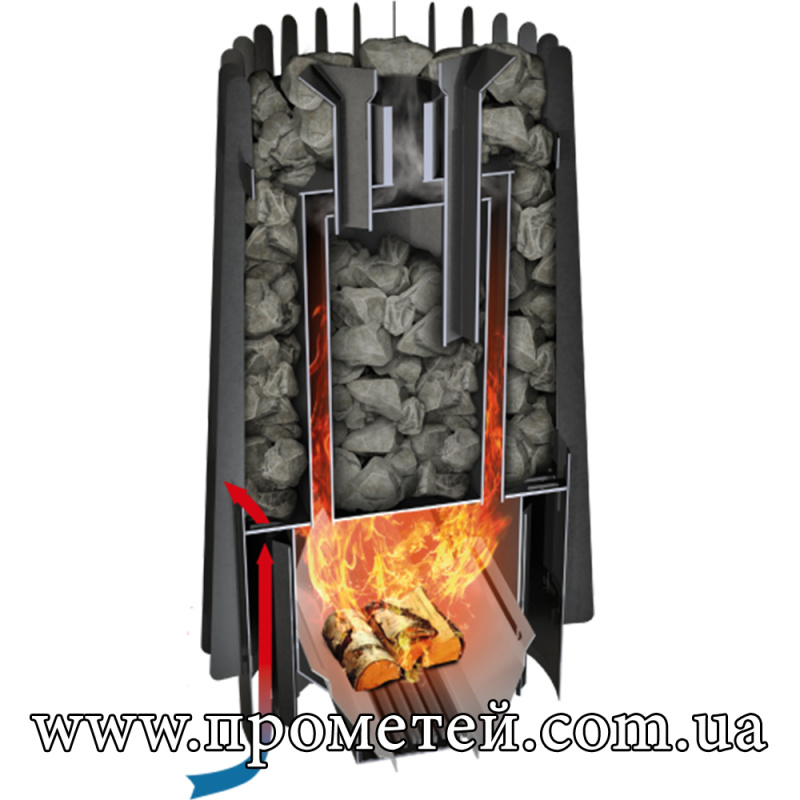 Корпус печі виконаний з високоякісної жаростійкої сталі 4-8 мм та доповнений стильним зовнішнім кожухом з вертикальними ребрами. Модель з виносною топкою дозволяє здійснювати завантаження дров із сусіднього приміщення (передбанника), що зберігає чистоту в парній та захищає її від диму і гару. Така конструкція особливо зручна при облаштуванні комерційних бань або при плануванні регулярних банних процедур.