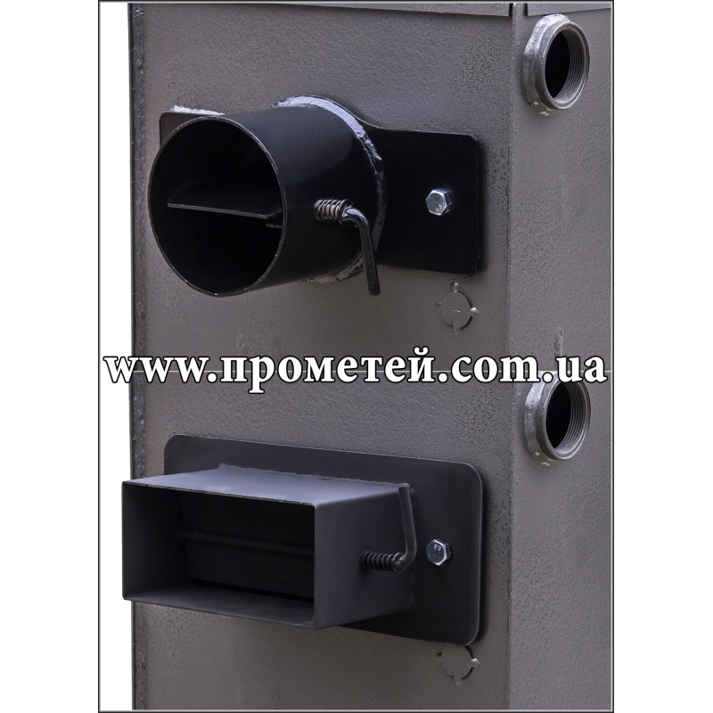 Котел рекомендується використовувати в парі з регулятором тяги (встановлюється з будь-якої сторони). Він продовжує час горіння та знижує витрату палива.