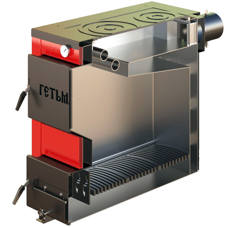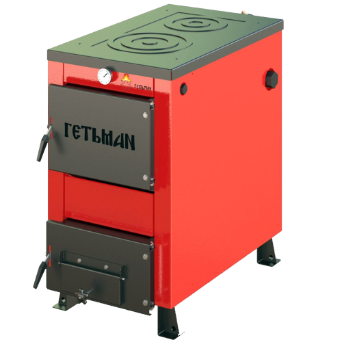 Також котел Гетьман 17,5П вирізняється збільшеною глибиною камери згоряння та можливістю роботи від електричного ТЕНа. Завдяки продуманій конструкції теплообмінника, котел ефективно розподіляє тепло між водяним контуром опалення та варильною поверхнею, зберігаючи високий ККД до 80%.