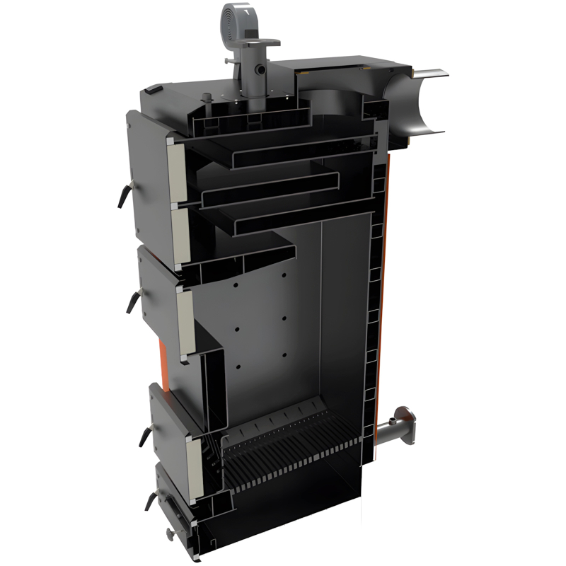 - Зонна подача повітря та допалювання піролізних газів – рівномірна подача первинного повітря під колосники та наявність спеціальних повітряних форсунок для вторинного повітря безпосередньо в камері згоряння забезпечують повне згоряння палива і виділених піролізних газів. Це не тільки підвищує ефективність тепловіддачі, але й зменшує викиди сажі, знижуючи частоту чистки димоходу.