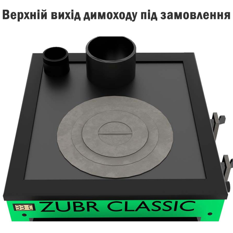 Утеплена версія. Тобто конструкція залишається такою ж, але в модель котла Zubr Classic Termo 15 з плитою додається утеплений кожух (мінеральна вата) та вбудований електронний термометр, що знижує тепловтрати та підвищує безпечність експлуатації. Ідеальний варіант для встановлення у житлових приміщеннях або там, де не потрібно гріти саму котельню.
