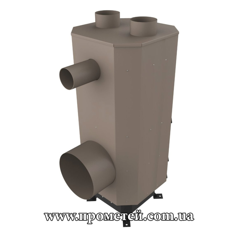 Тепло, отримане в результаті спалювання палива, передається через металевий теплообмінник теплоносію (повітрю) і пододається через патрубки виходу теплого повітря – 2 шт. по 200мм. Нагріте повітря може обігрівати приміщення в якому стоїть теплогенератор, або доставлятись до потрібного приміщення через гофрировані трубопроводи (не входять до комплекту).