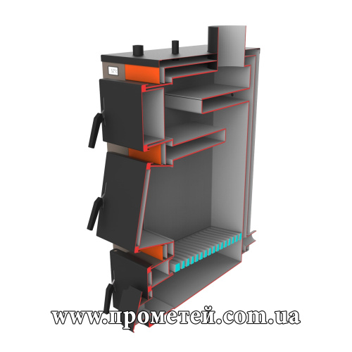 Конструкцией предусмотрен развитый теплообменник, состоящий из двух полок. Благодаря этому дымовые газы отдают дополнительно тепло в систему отопления (повышая КПД), а не вылетают сразу в дымовую трубу. Для чистки теплообменника предусмотрена отдельная дверца в верхней части котла.