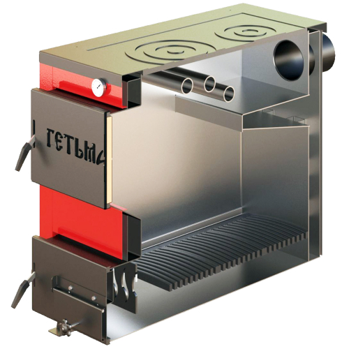 Также котел Гетьман 22П отличается увеличенной глубиной камеры сгорания и возможностью работы от электрического ТЭНа. Благодаря продуманной конструкции теплообменника, котел эффективно распределяет тепло между водяным контуром отопления и варочной поверхностью, сохраняя высокий КПД до 80%.