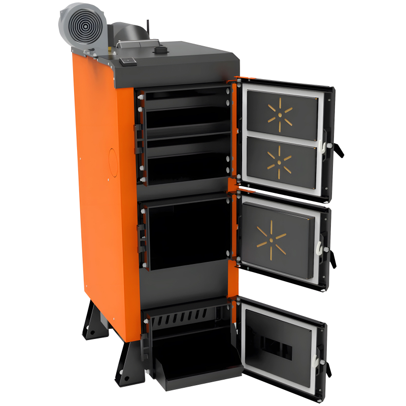 - Увеличенная камера сгорания и широкие дверцы – вместительная топка позволяет загрузить большой объём топлива за один раз, обеспечивая время непрерывного горения от 8 до 24 часов (в зависимости от типа топлива). Увеличенные дверцы делают процесс загрузки габаритных дров и обслуживания котла быстрым и комфортным.