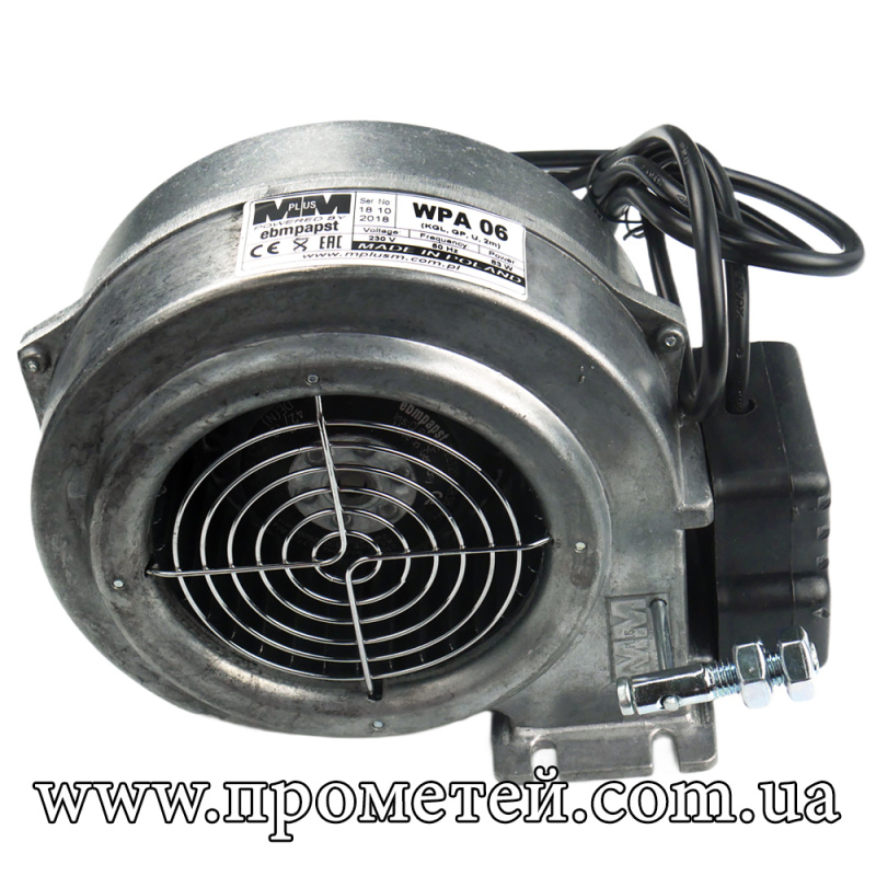 MplusM WPA 06 (EBM, KGL, GP, U, 2,0м) – вентилятор (турбіна) для примусової подачі повітря в топку твердопаливних котлів потужністю до 45 кВт (орієнтовно) з вузьким фланцем. Також ефективно використовується для вентиляції приміщень та промислового обладнання.