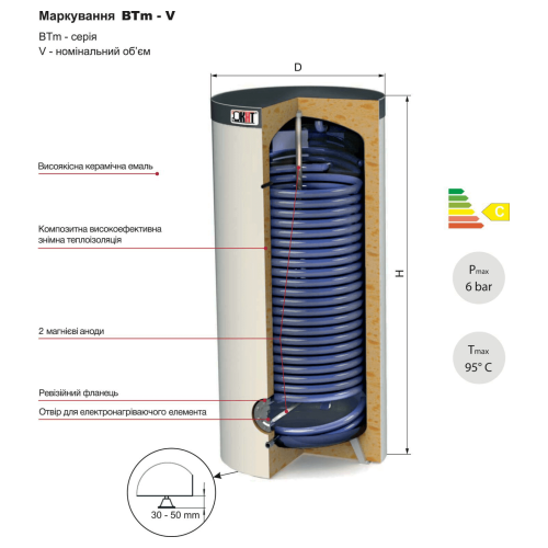 - Патрубок під ТЕН 6/4" – конструктивно передбачена можливість встановлення електричного нагрівального елемента, завдяки якому бак-накопичувач перетворюється на автономне джерело ГВП у літній період.