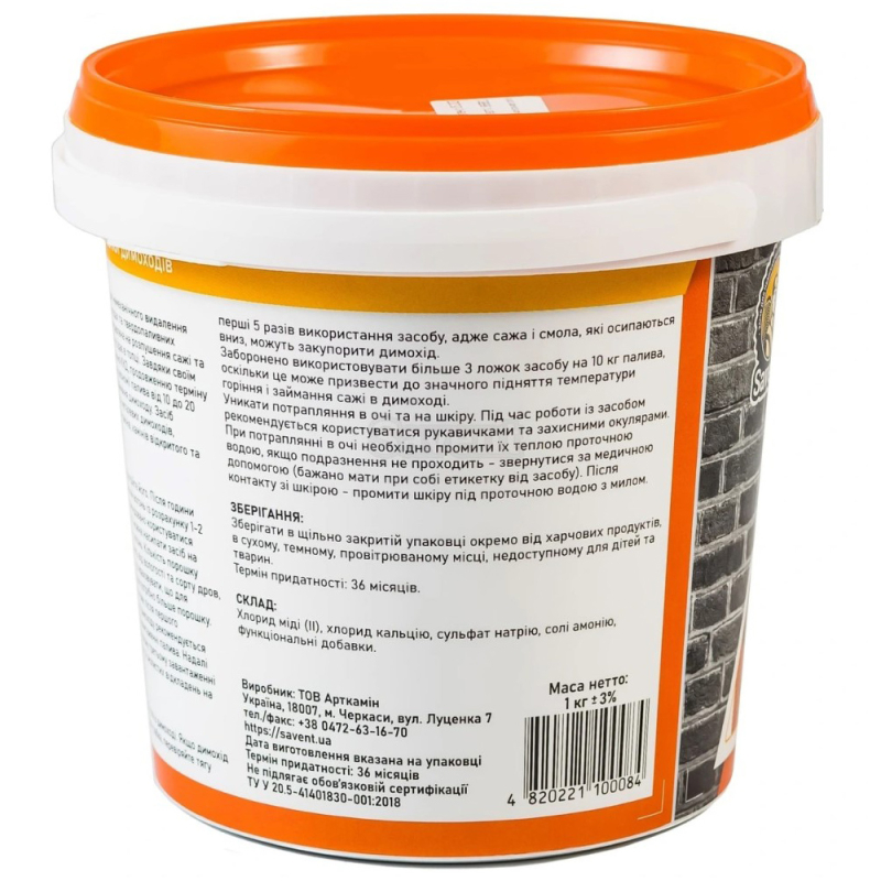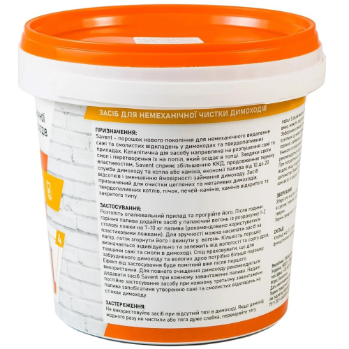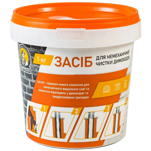 Засіб для немеханічної чистки димоходів Savent забезпечує повний розпад органічних речовин і сажі до вуглекислого газу та води. Він не взаємодіє з металом, не викликає корозію і повністю вигоряє, не залишаючи слідів. Завдяки своїм властивостям, засіб Savent сприяє збільшенню ККД опалювального приладу на 10-20%, продовженню терміну служби димоходу та котла, економії палива та зменшенню ймовірності займання димоходу.