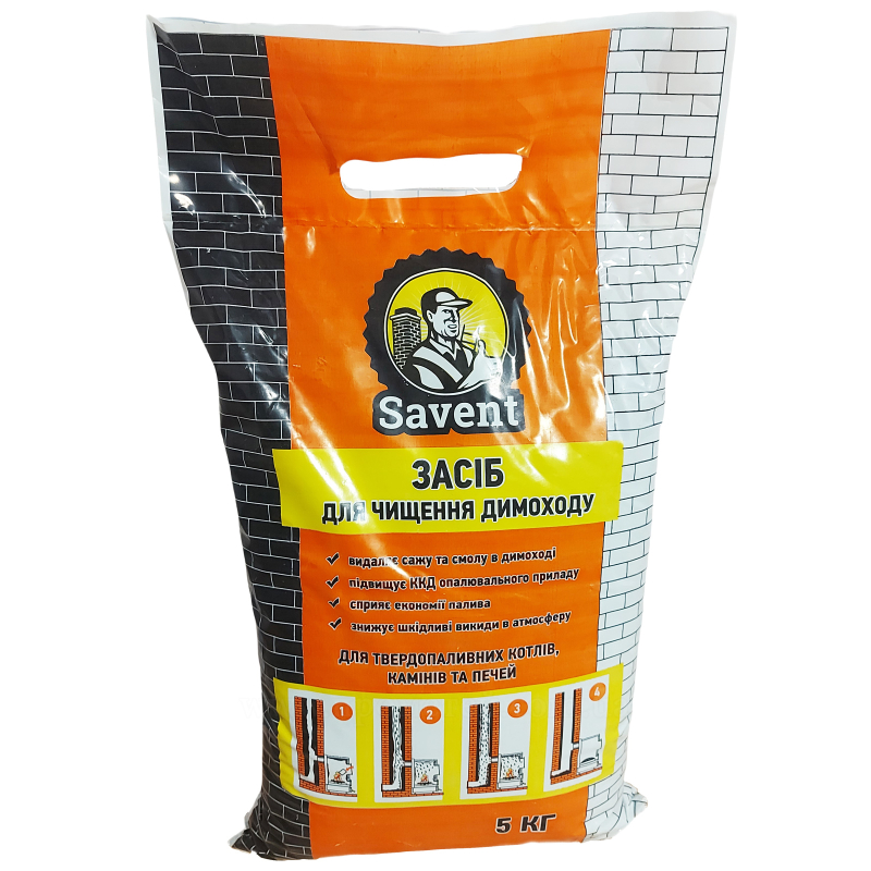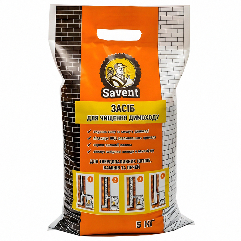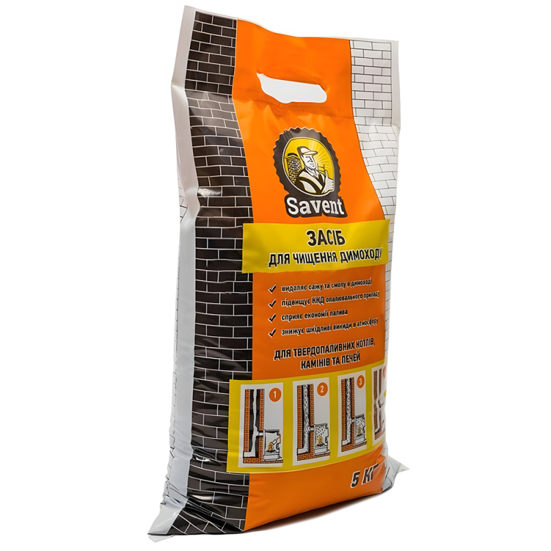 Засіб для чистки димоходу Savent 5 кг забезпечує повний розпад органічних речовин і сажі до вуглекислого газу та води. Він не взаємодіє з металом, не викликає корозію і повністю вигоряє, не залишаючи слідів. Завдяки своїм властивостям, засіб Savent сприяє збільшенню ККД опалювального приладу на 10-20%, продовженню терміну служби димоходу та котла, економії палива та зменшенню ймовірності займання димоходу.